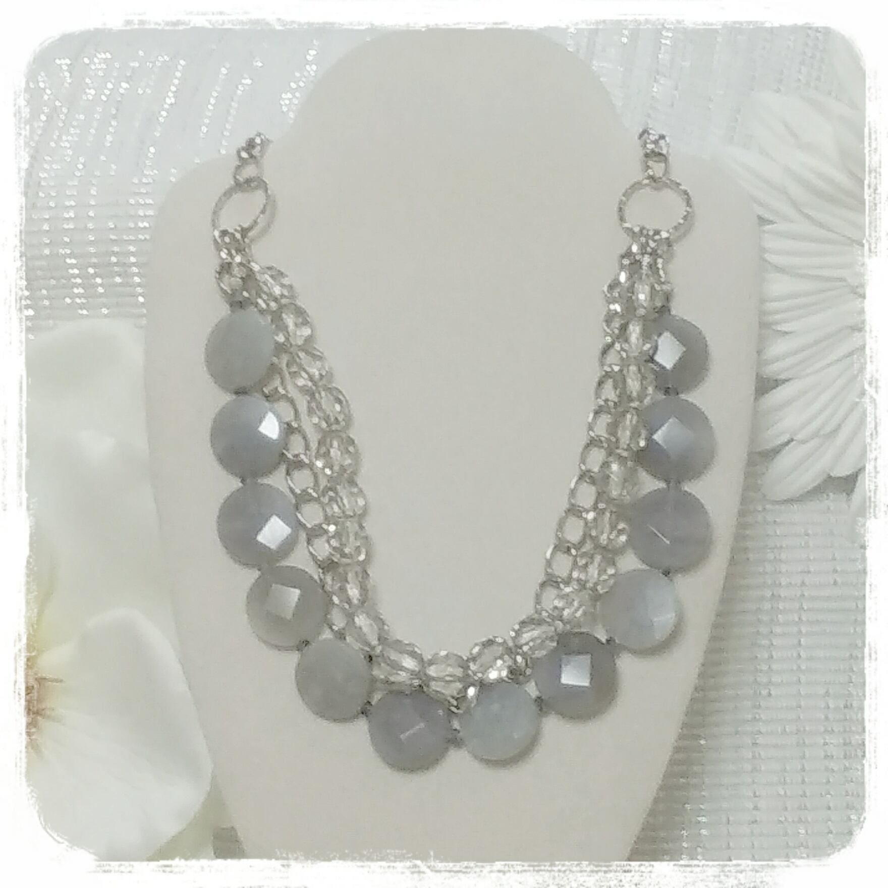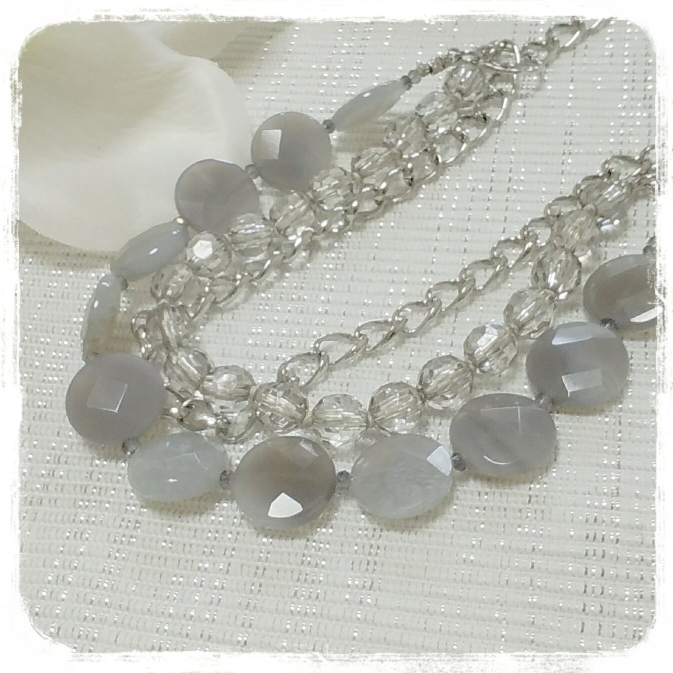 グレーメノウ…一見地味な石ですが、シルバーチェーンと少しグレーがかったプラスチックビーズとの三連が都会的なネックレスになりました。