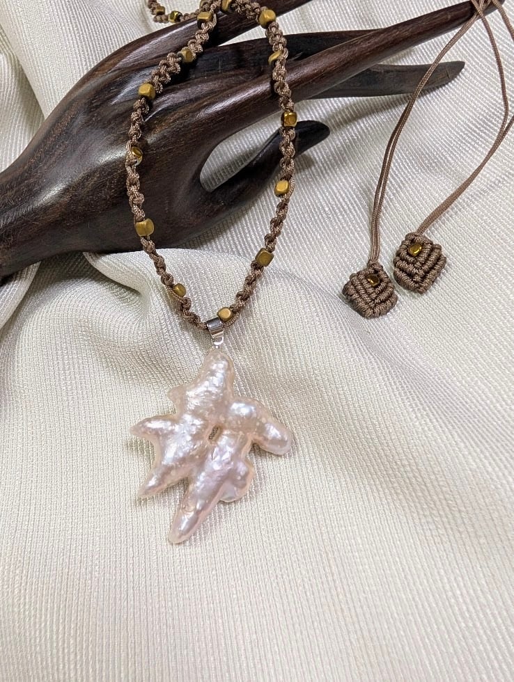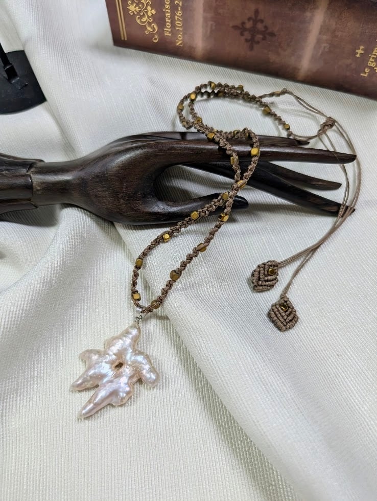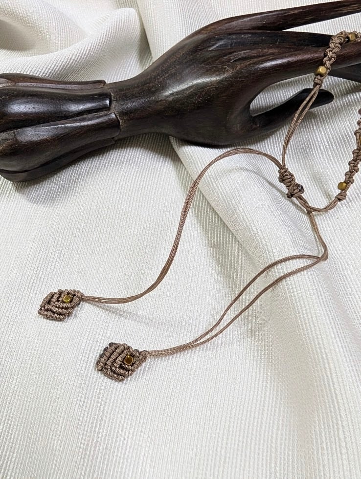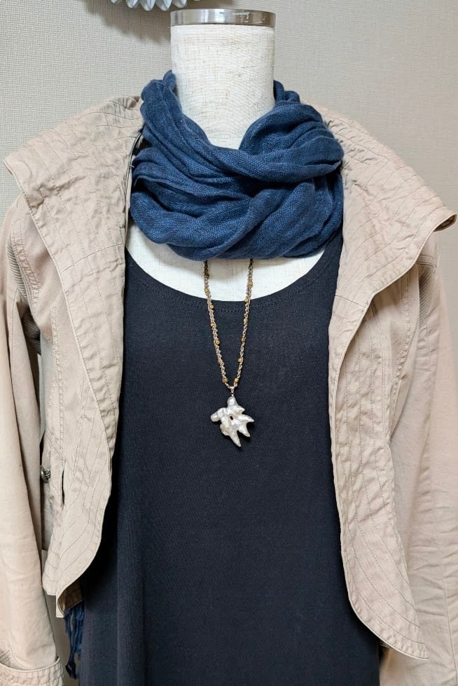 コードで編んでいますのでお首回りにやさしい仕様、長さも調節できます。
