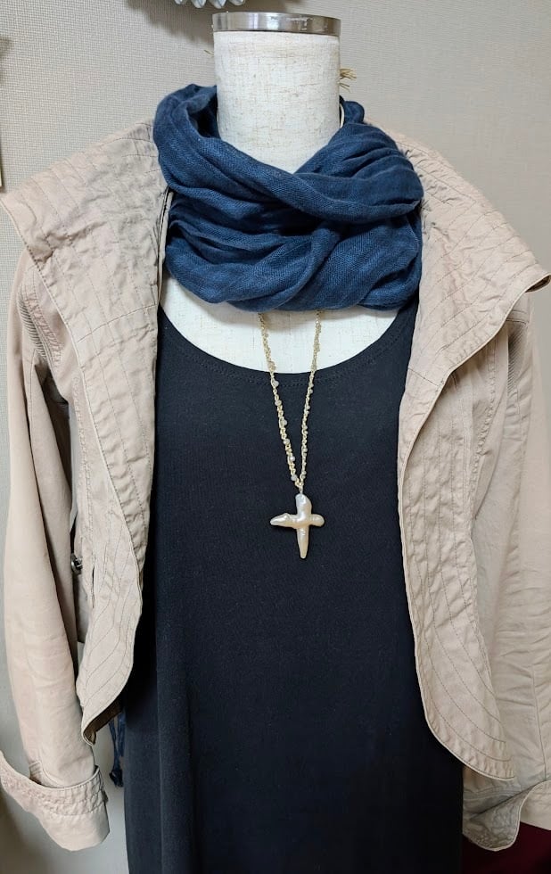 コードで編んでいますのでお首回りにやさしい仕様、長さも調節できます。