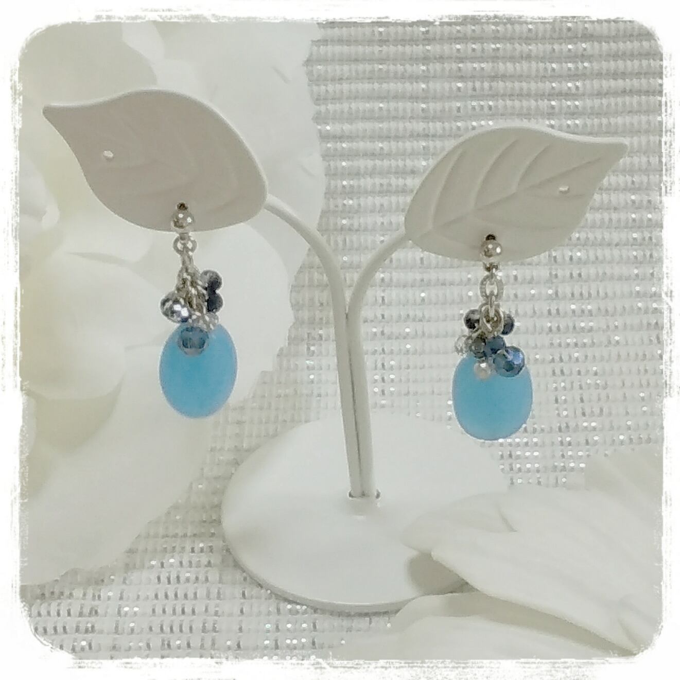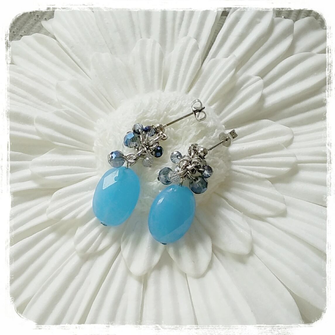 鮮やかなブルーアゲートに紺色のガラスカットビーズがシャラシャラと耳元で涼やかな音を奏でる華やかなピアスです。