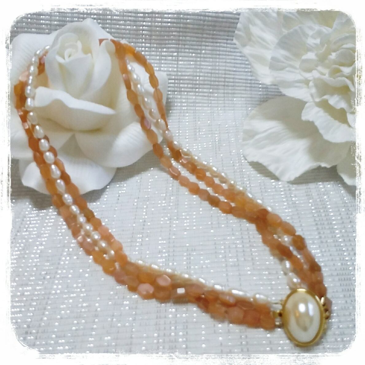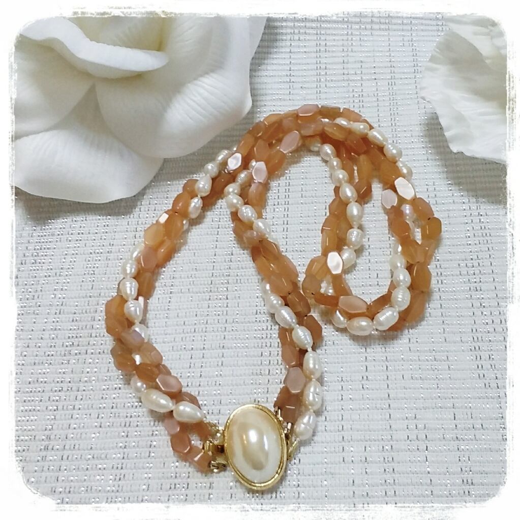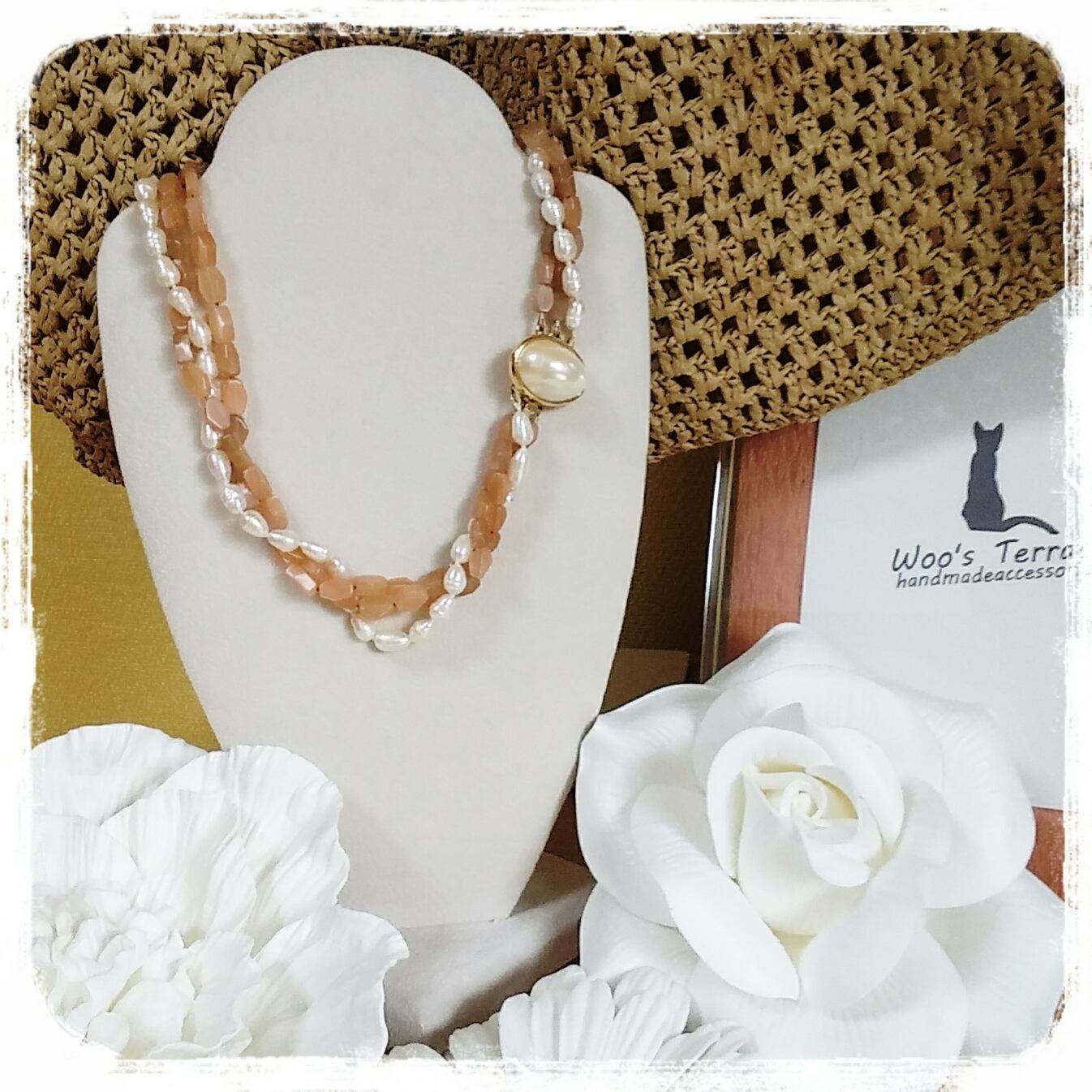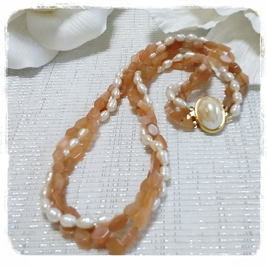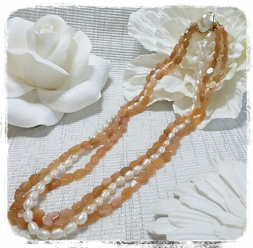 柔らかなサーモンピンク色のオレンジムーンストーンと淡水ケシパールで三連ネックレス