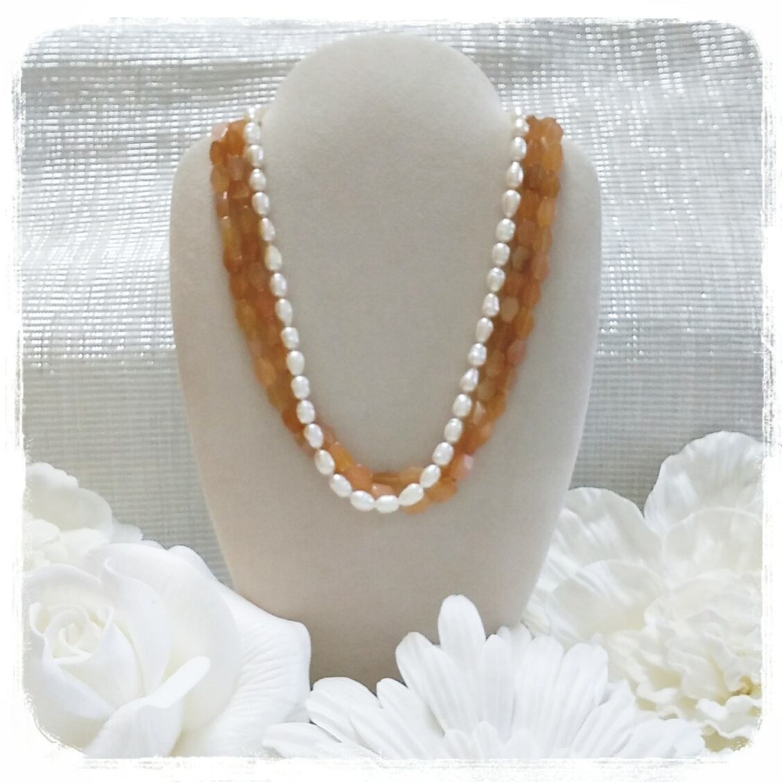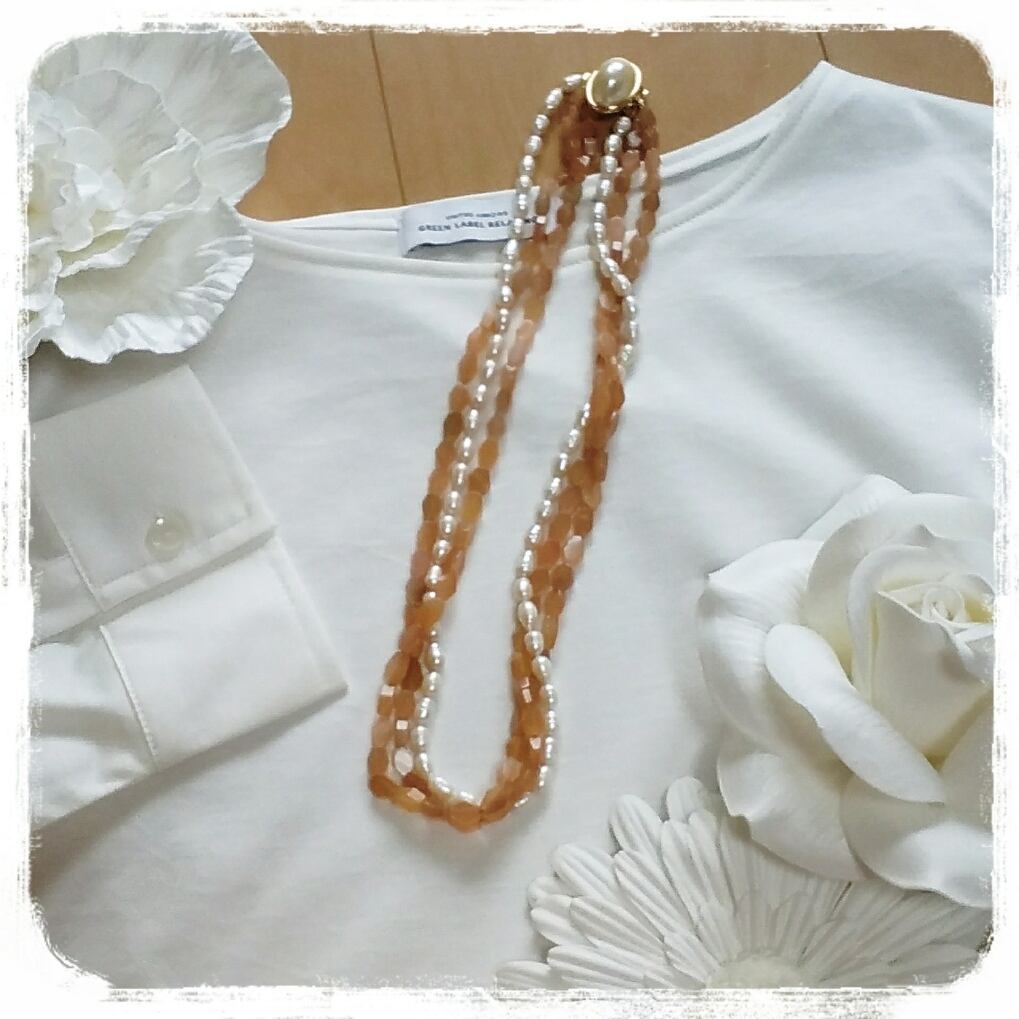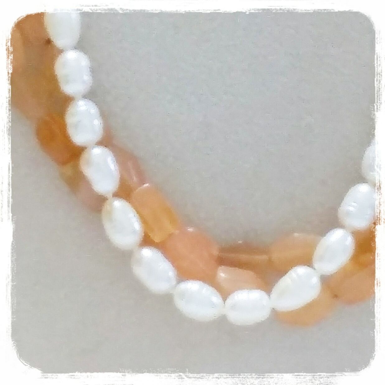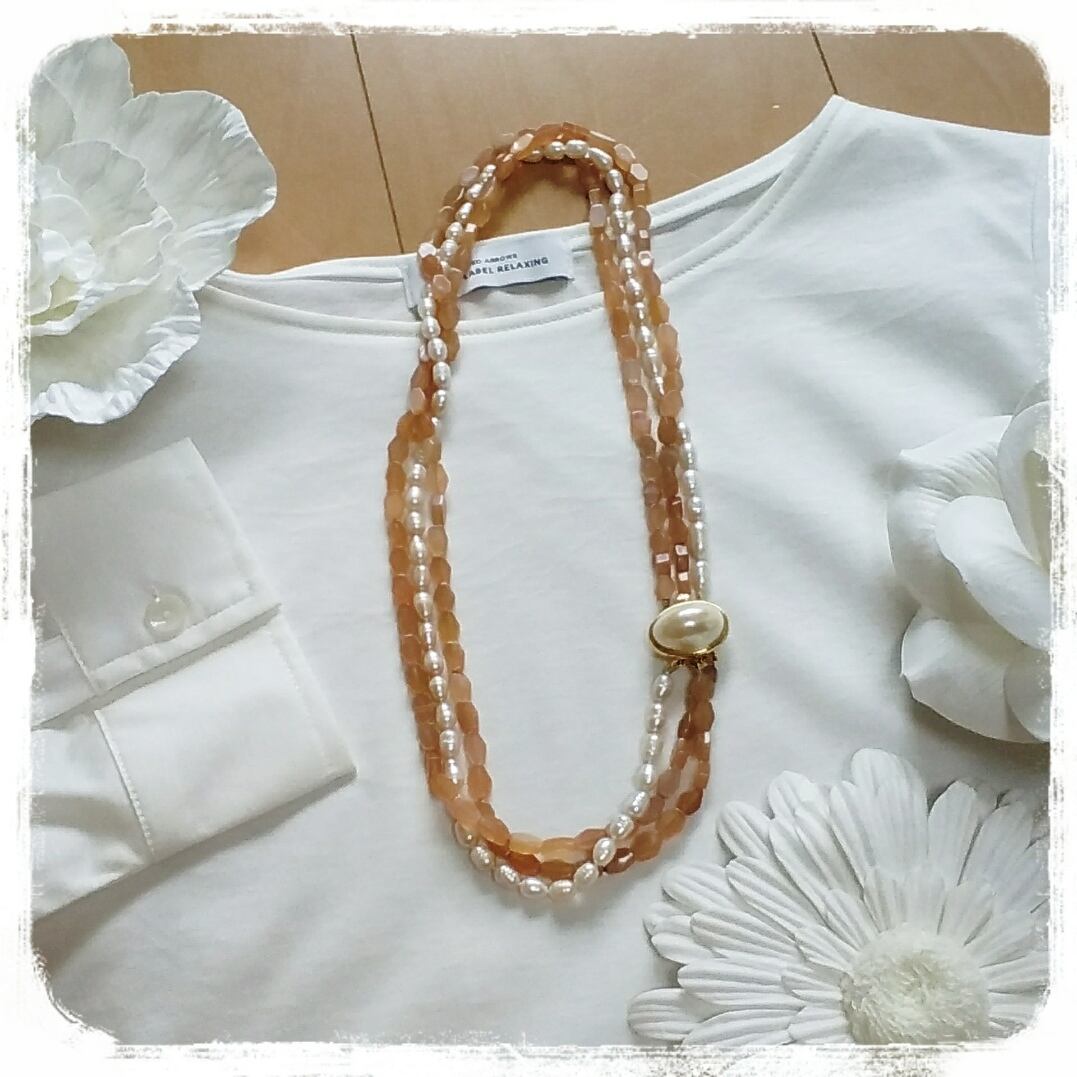 柔らかなサーモンピンク色のオレンジムーンストーンと淡水ケシパールで三連ネックレス