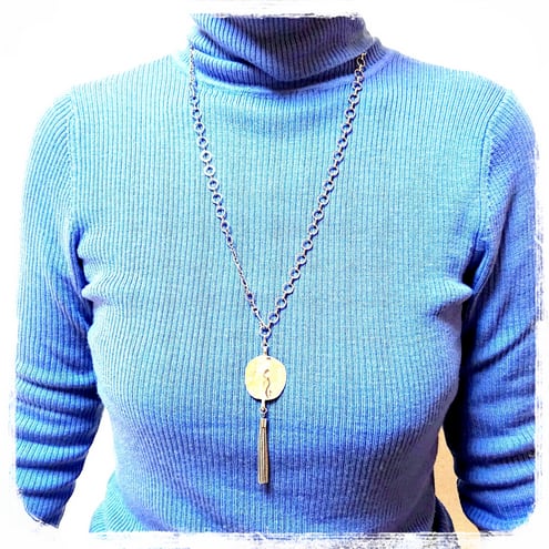 大振りなメタルパーツがとても目を引き、チェーンタッセルがキラキラと揺れるネックレスです。
