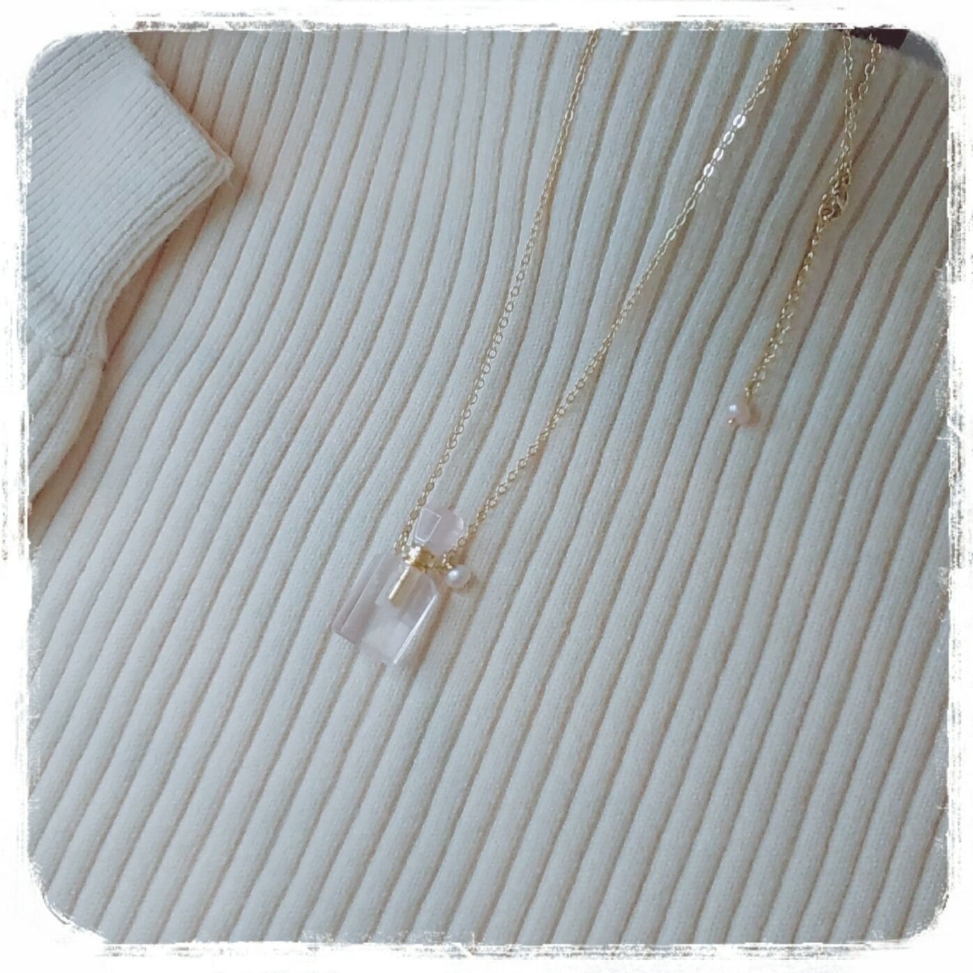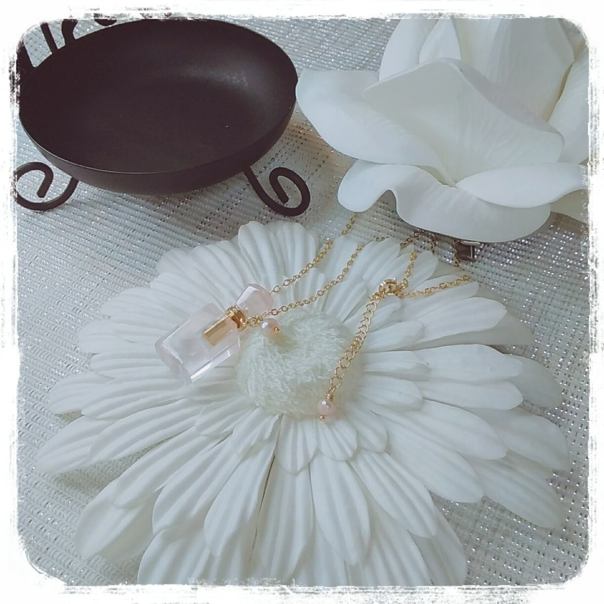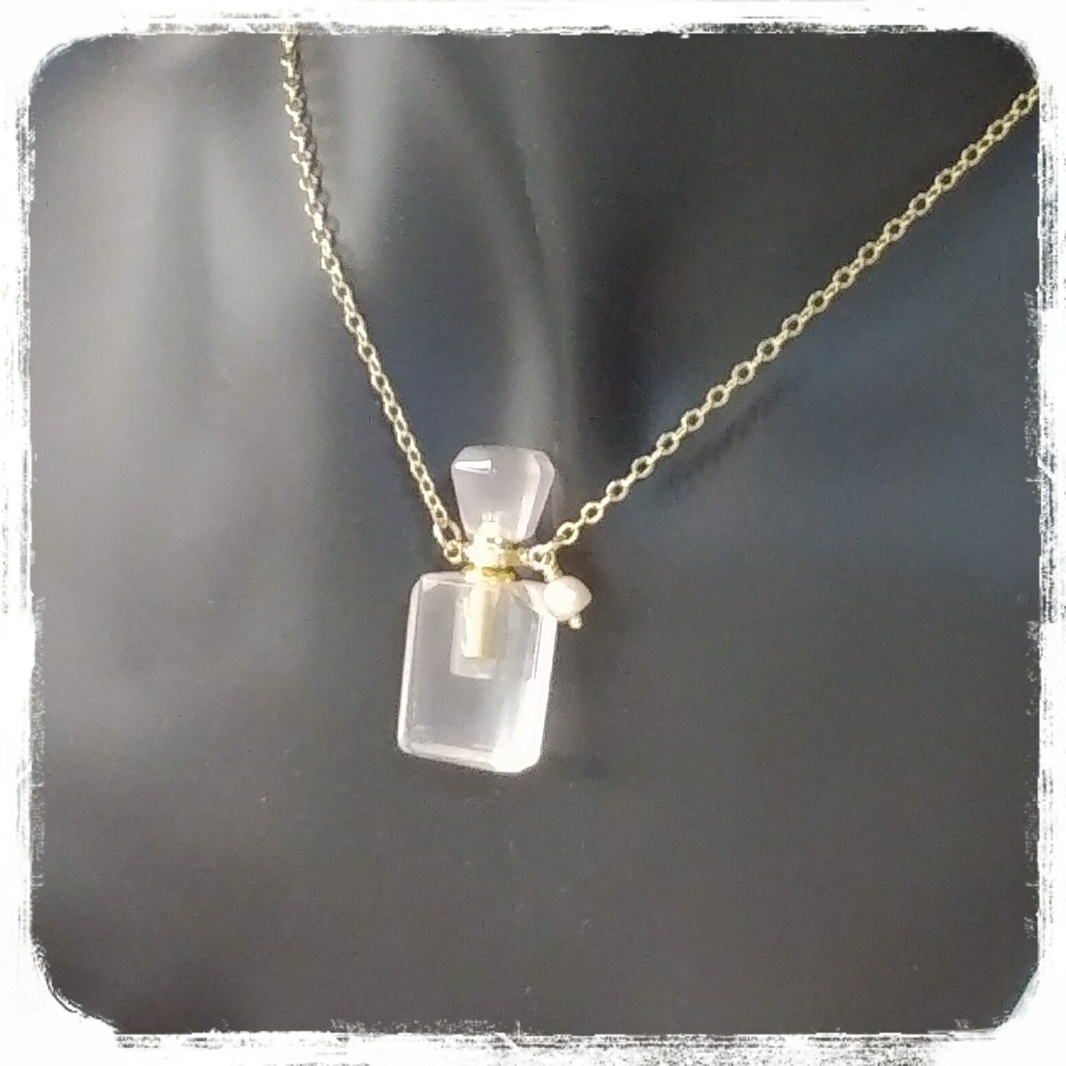 淡いピンクのパフュームボトルネックレス。