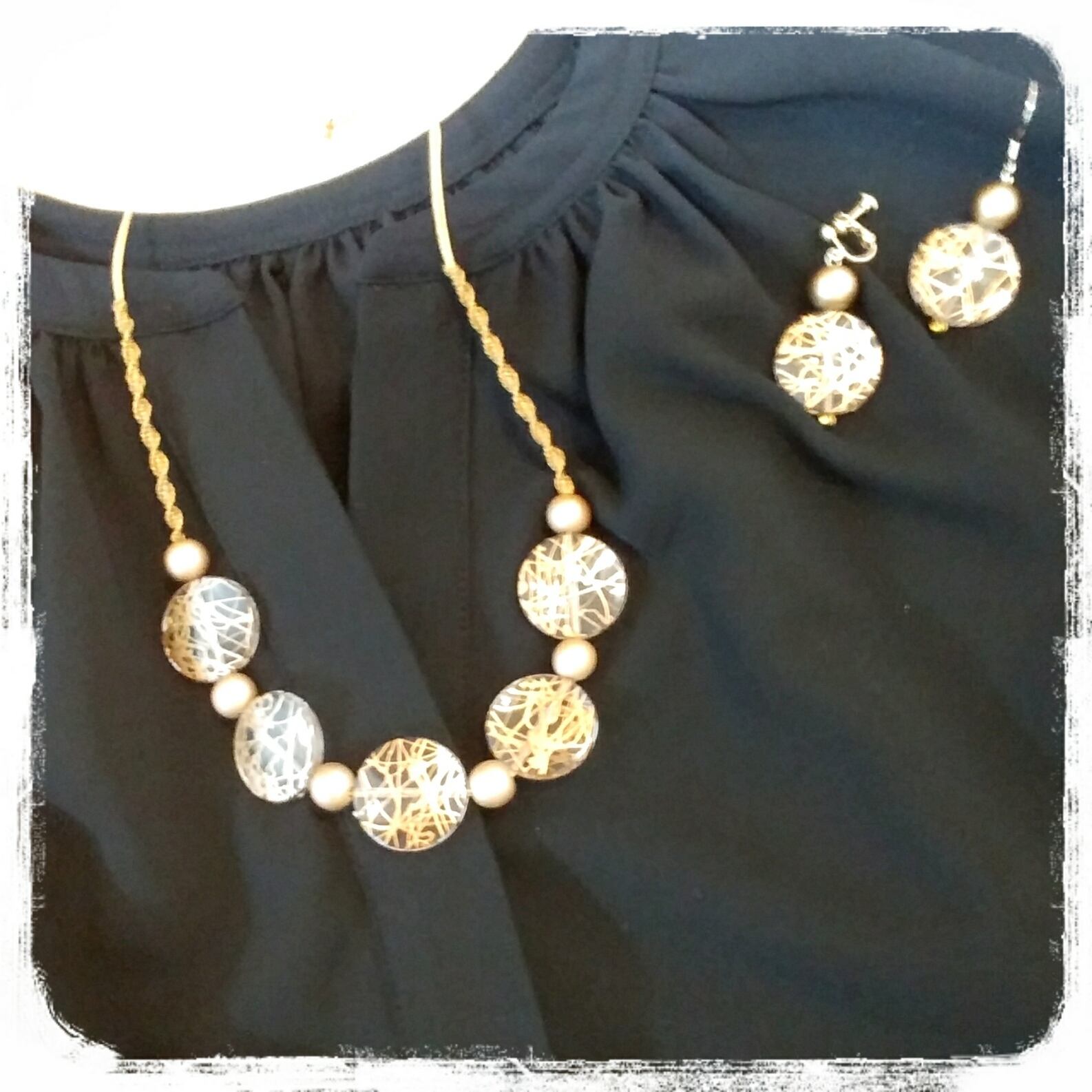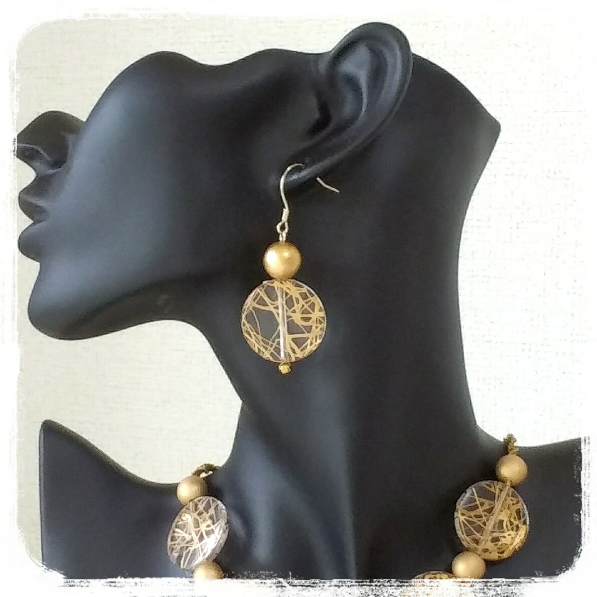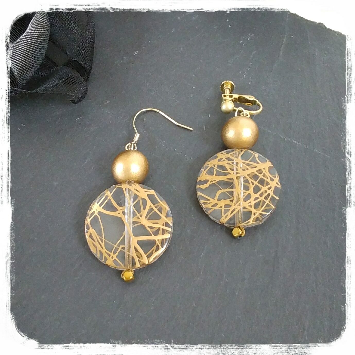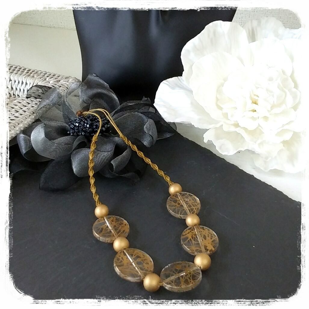 透明なアクリルパーツにゴールドの模様、艶消しゴールドのウッドパーツ。