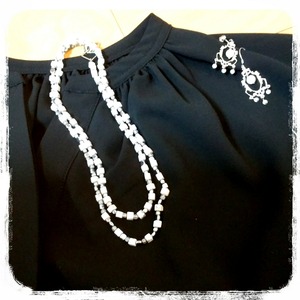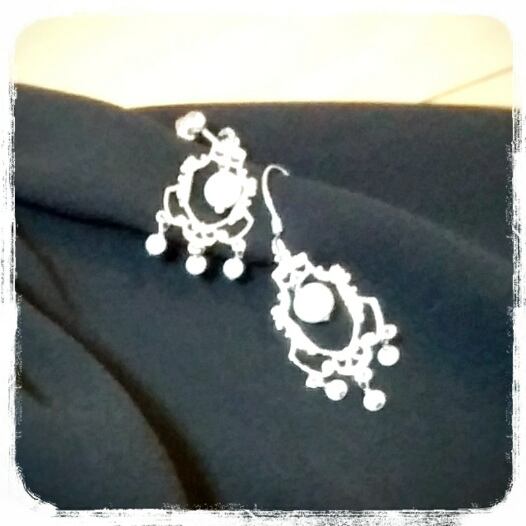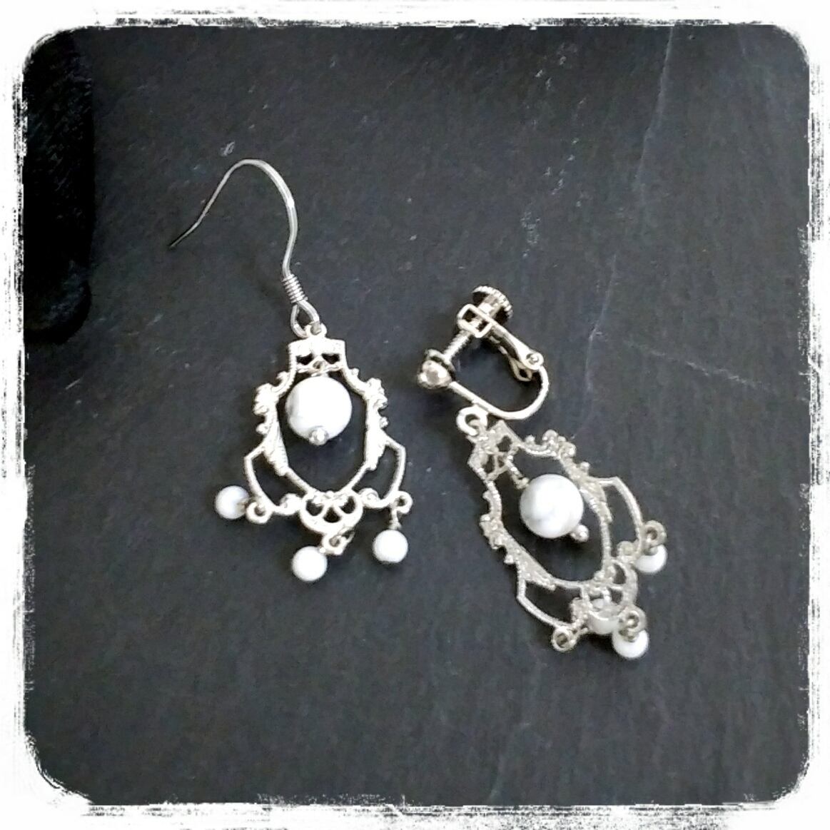繊細な透かし模様のメタルパーツに大小のハウライトが揺れる耳元。