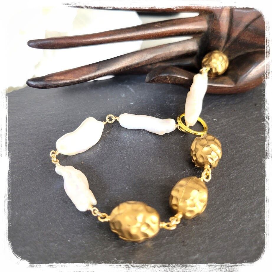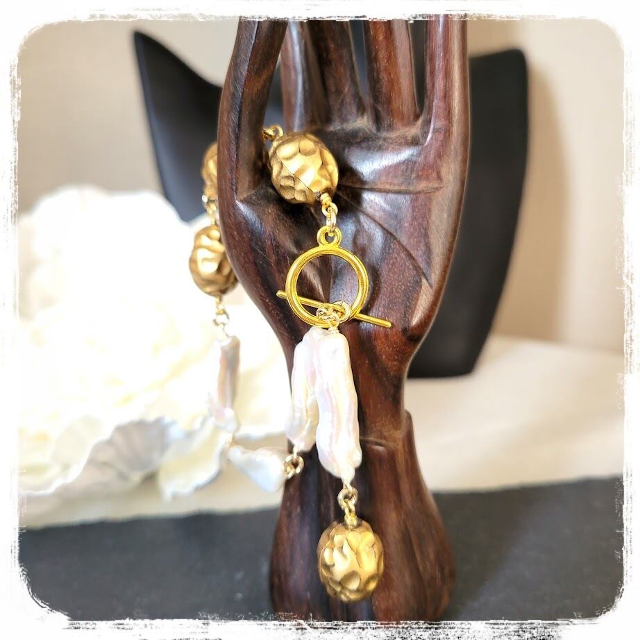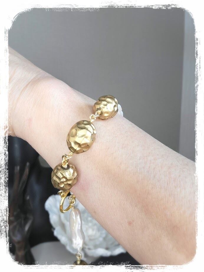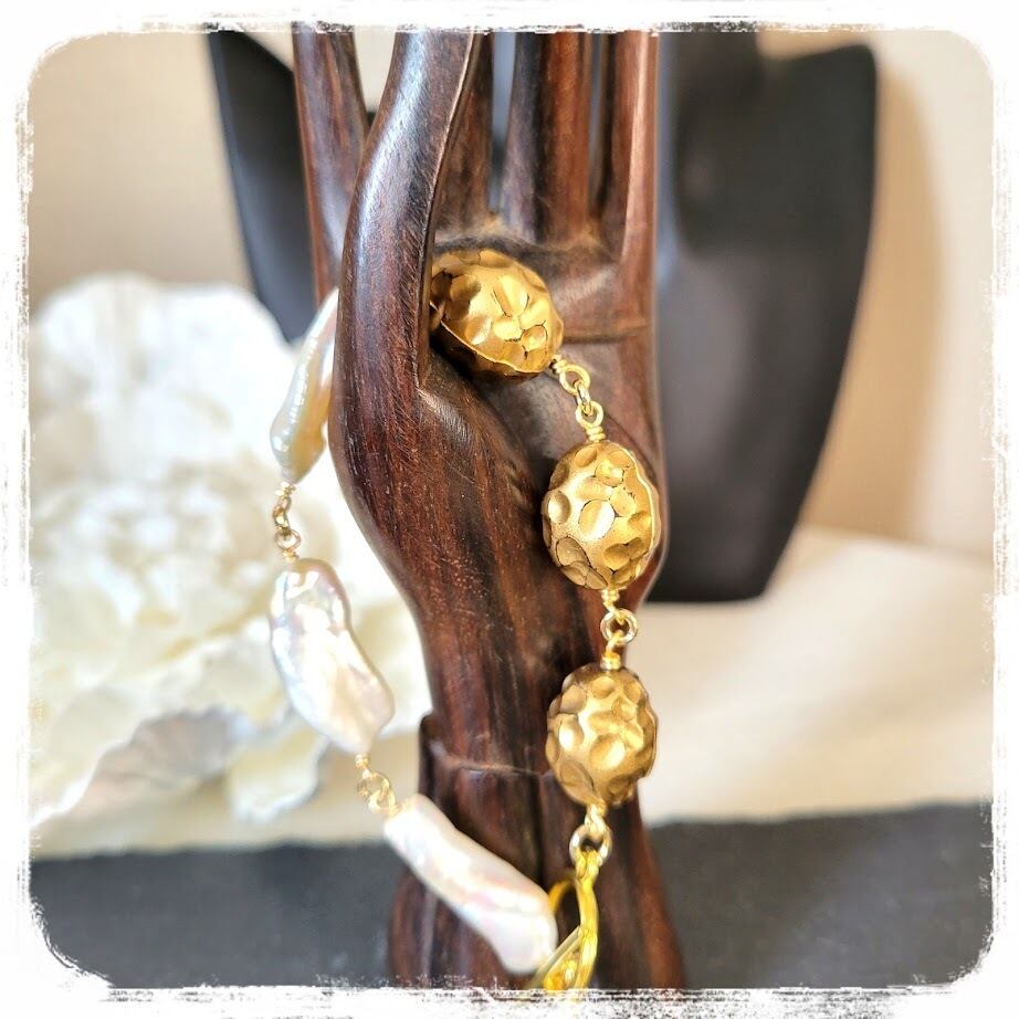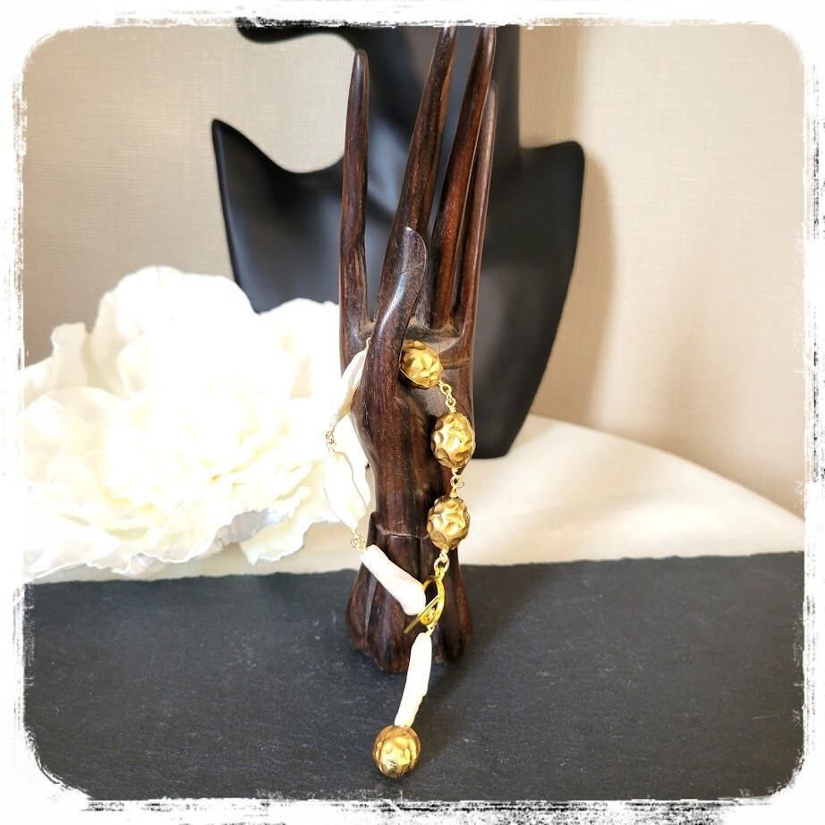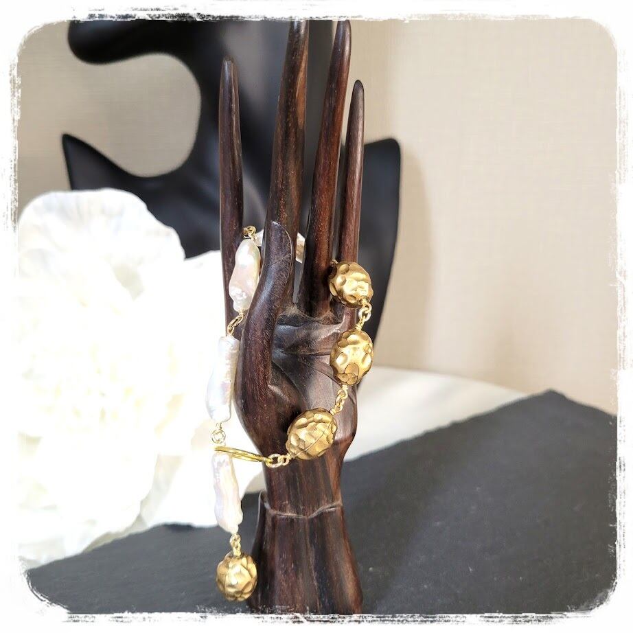 ビンテージ風な真鍮ボールと長めな淡水バロックパールとのコンビネーション。