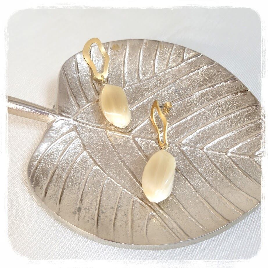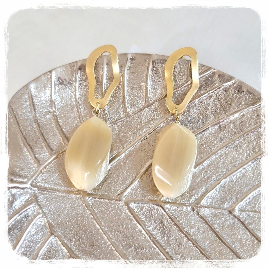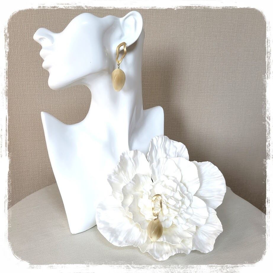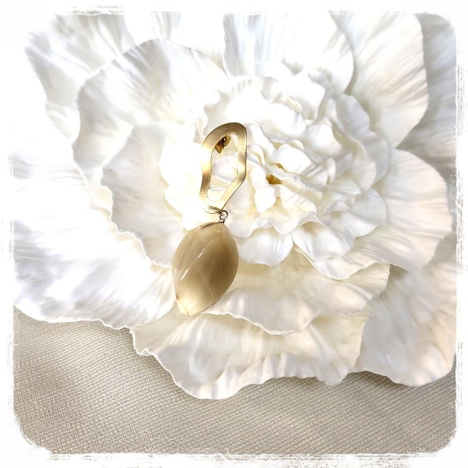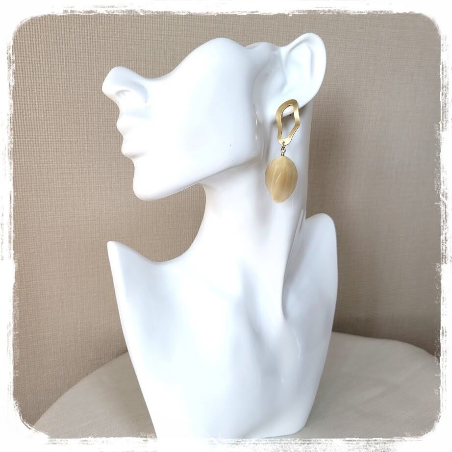 お肌馴染みの良い蜂蜜の様な色味の水牛パーツに、マットゴールドの変形リングが大人っぽいお品です。