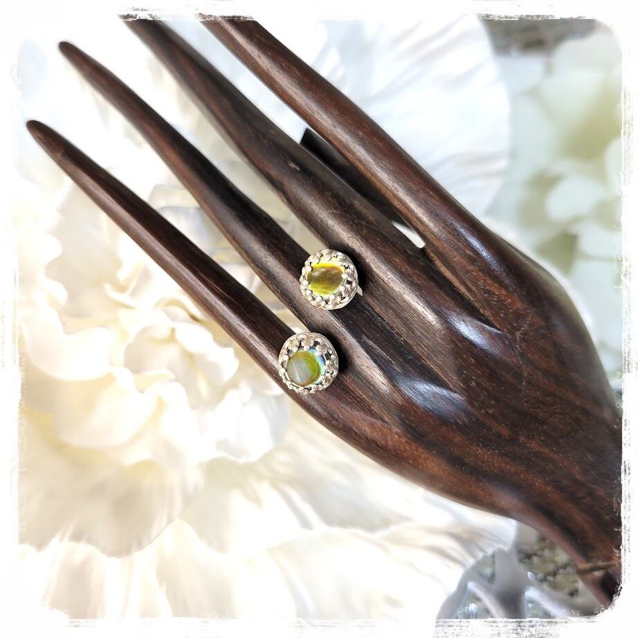 光の角度によりシェル特有の遊色効果で深みのあるグリーンがシックなひと品です。