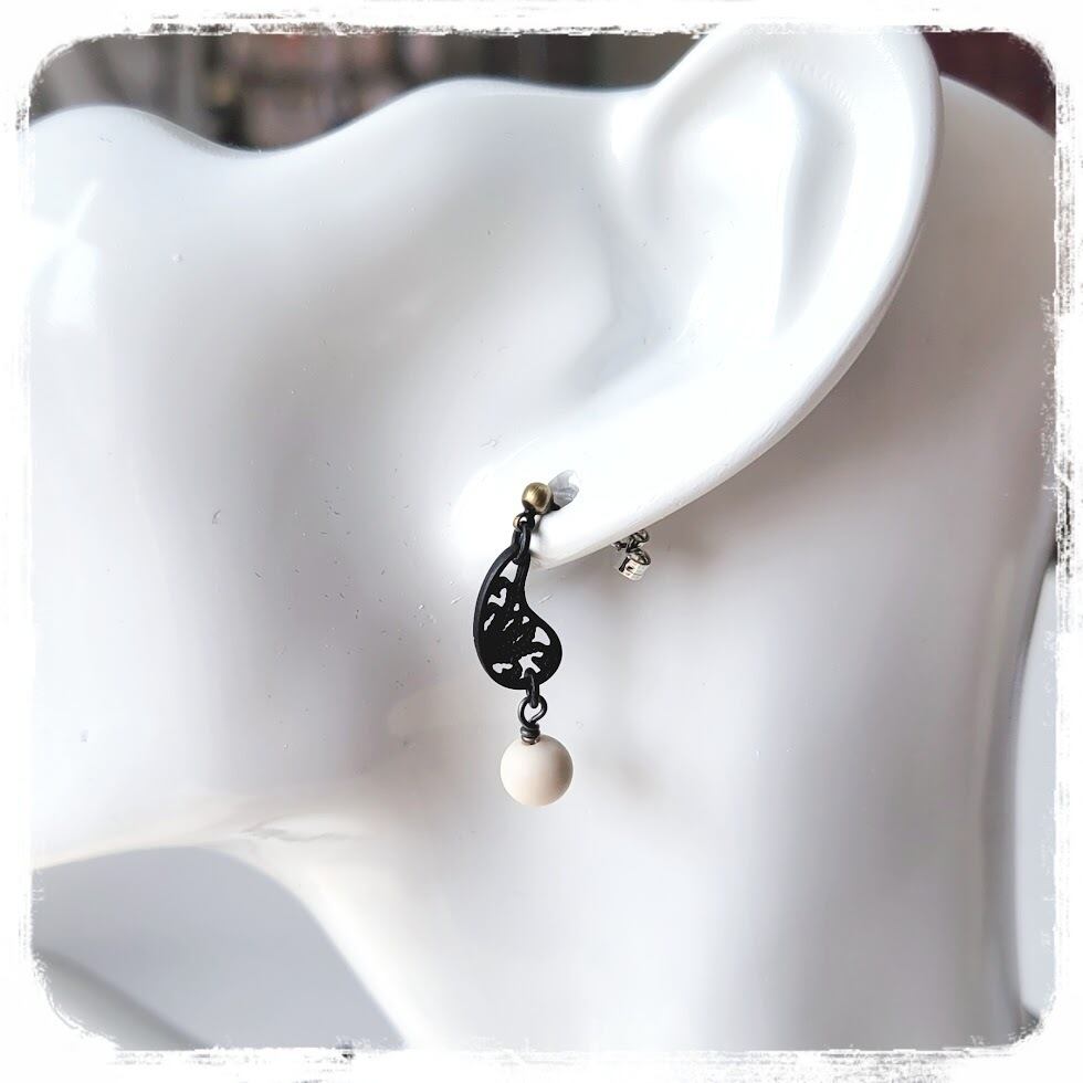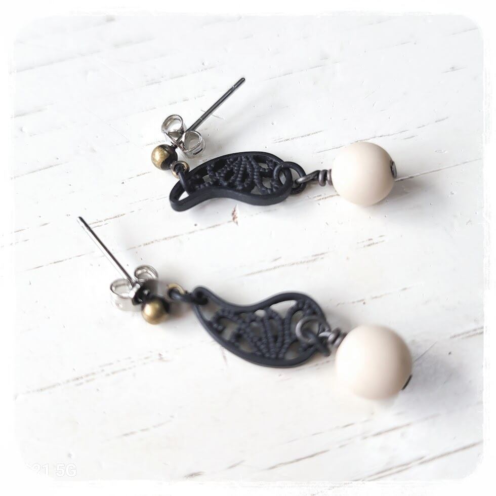 マットブラックのペイズリーパーツが控えめに揺れるピアス。