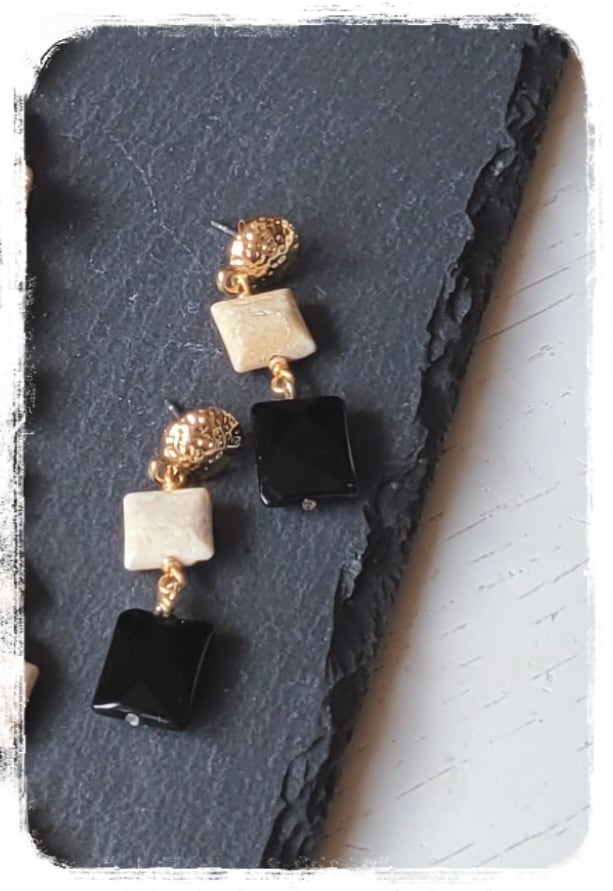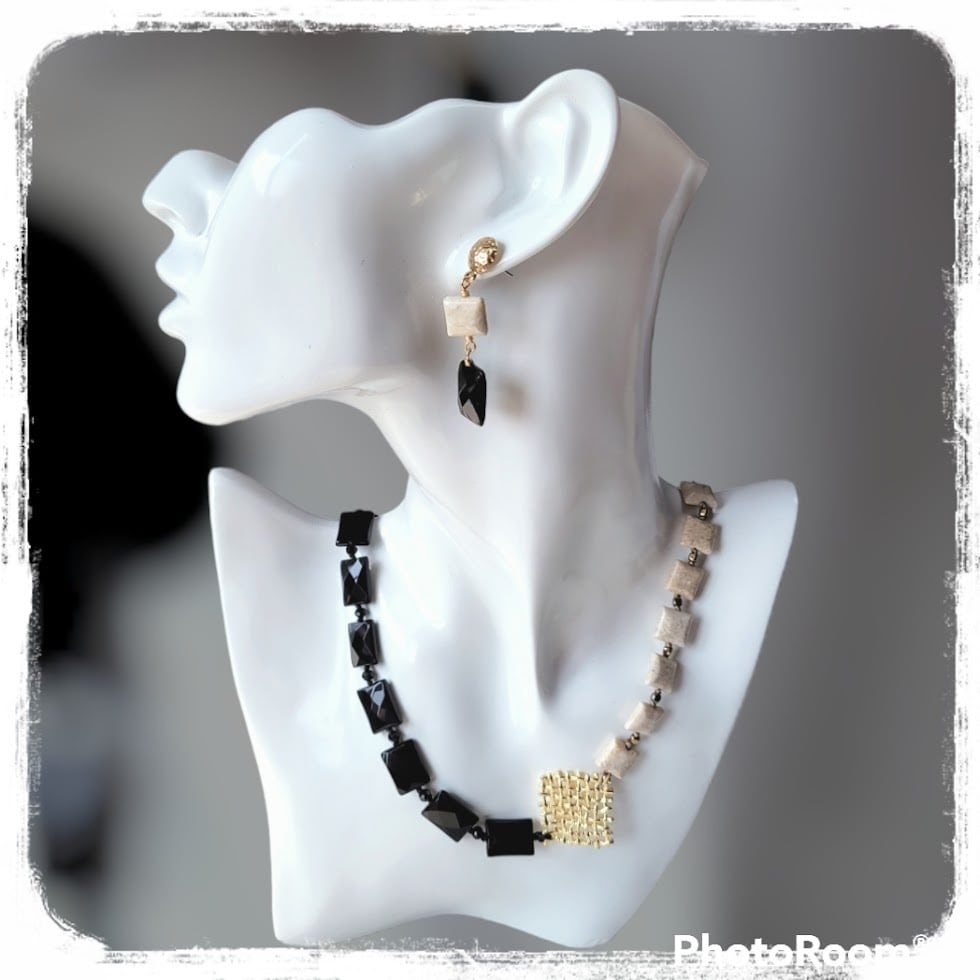 ネックレスと同じブラックとベージュのバイカラーピアス。